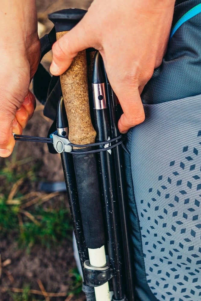 - Adjustable bungee attachment lets you secure trekking poles or ice axes; sternum strap buckle has safety whistle and hydration tube hose clip