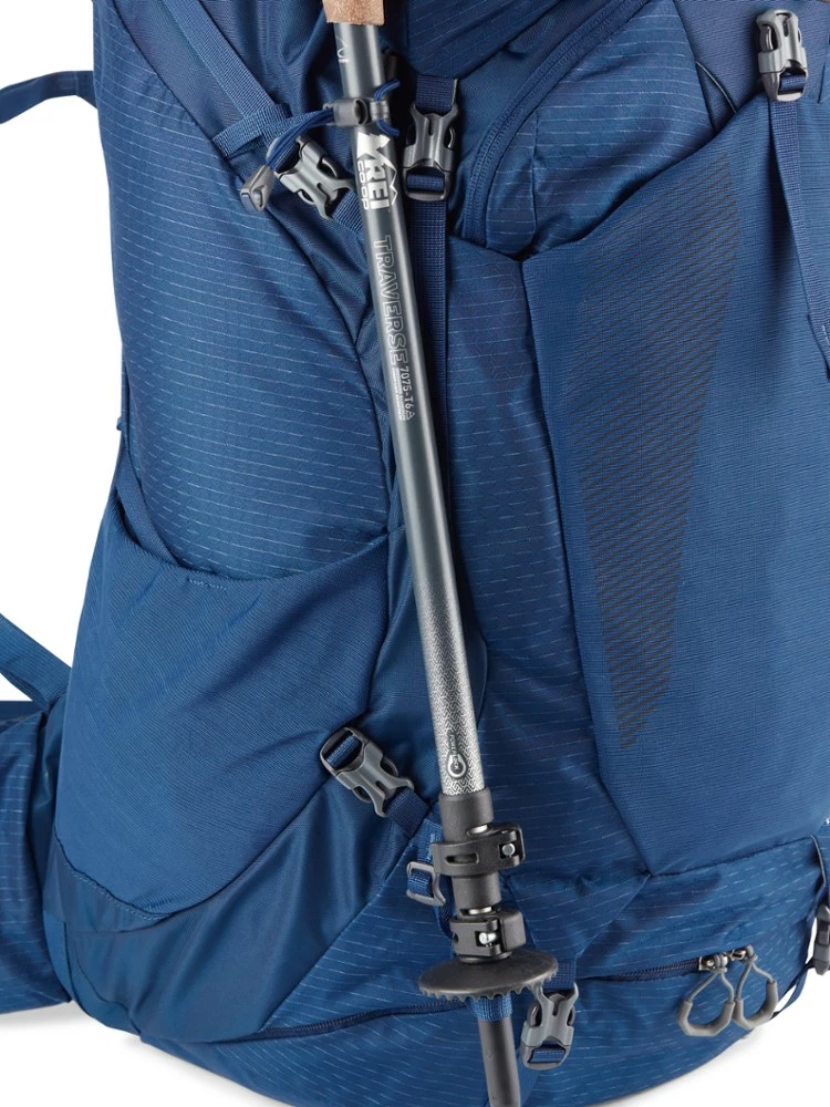 - Adjustable attachment loops and upper shock locks keep your trekking poles or ice tools secure