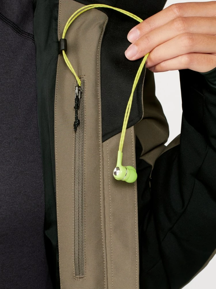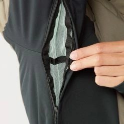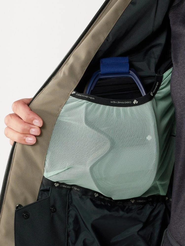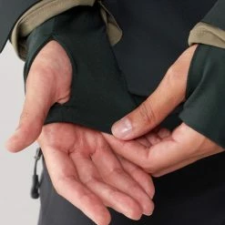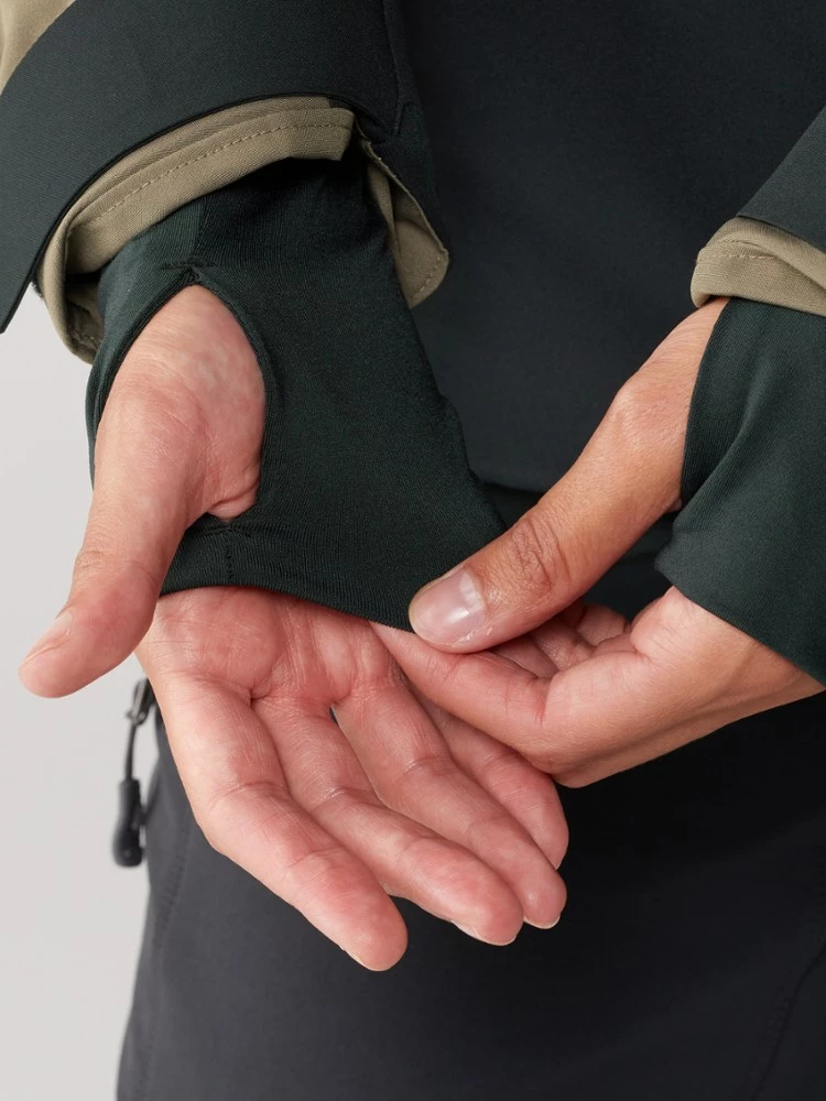 - Mesh gussets; fleece chin warmer; fleece-lined collar; interior wind guard; thumbhole inner cuffs; stretch lining panels; adjustable hem