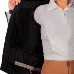 - Zippered handwarmer pockets; zippered chest pocket; zip pass pocket; lumbar pocket