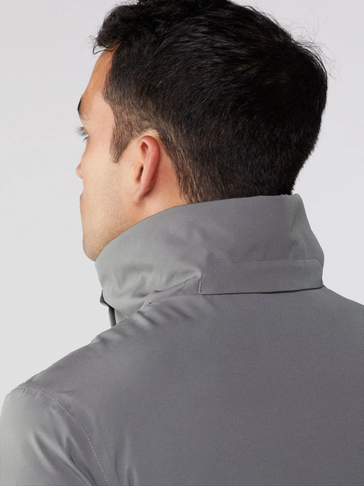 - Interior windguard; fleece-lined collar; quilted lining; faux leather trim