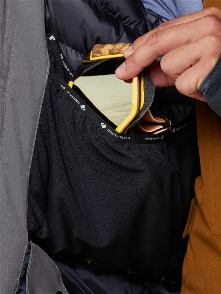 - Interior goggles pocket; interior stash pockets; detachable goggles cloth; cord routing guide